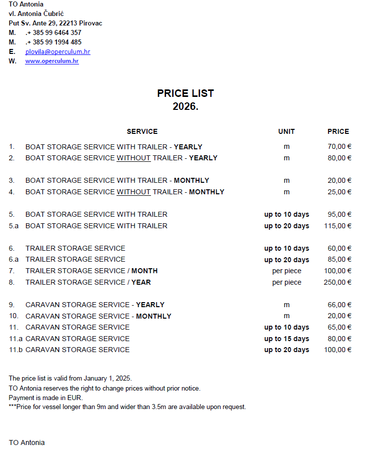Welcome to the dry marina in Pirovac, the ideal solution for the safe storage of your vessel all year round. Our marina is located just 1,000 meters from the sea, on a fenced area providing optimal conditions for storing boats, trailers, and camper vans. Location near major traffic routes and tourist destinations (Vodice, Tisno, Murter, Šibenik, Zadar, Split)