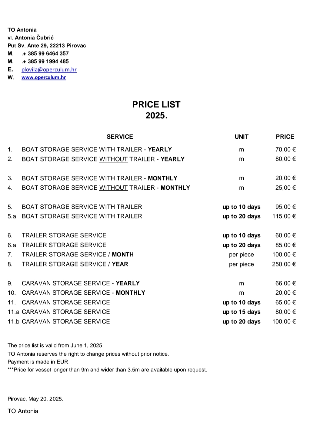 Der Gewerbebetrieb „Antonia“ bietet als Dienstleistungen auf dem Gebiet Mitteldalmatiens an: Bootslagerung, Stellplätze für Boots-Trailer und Wohnwagen.